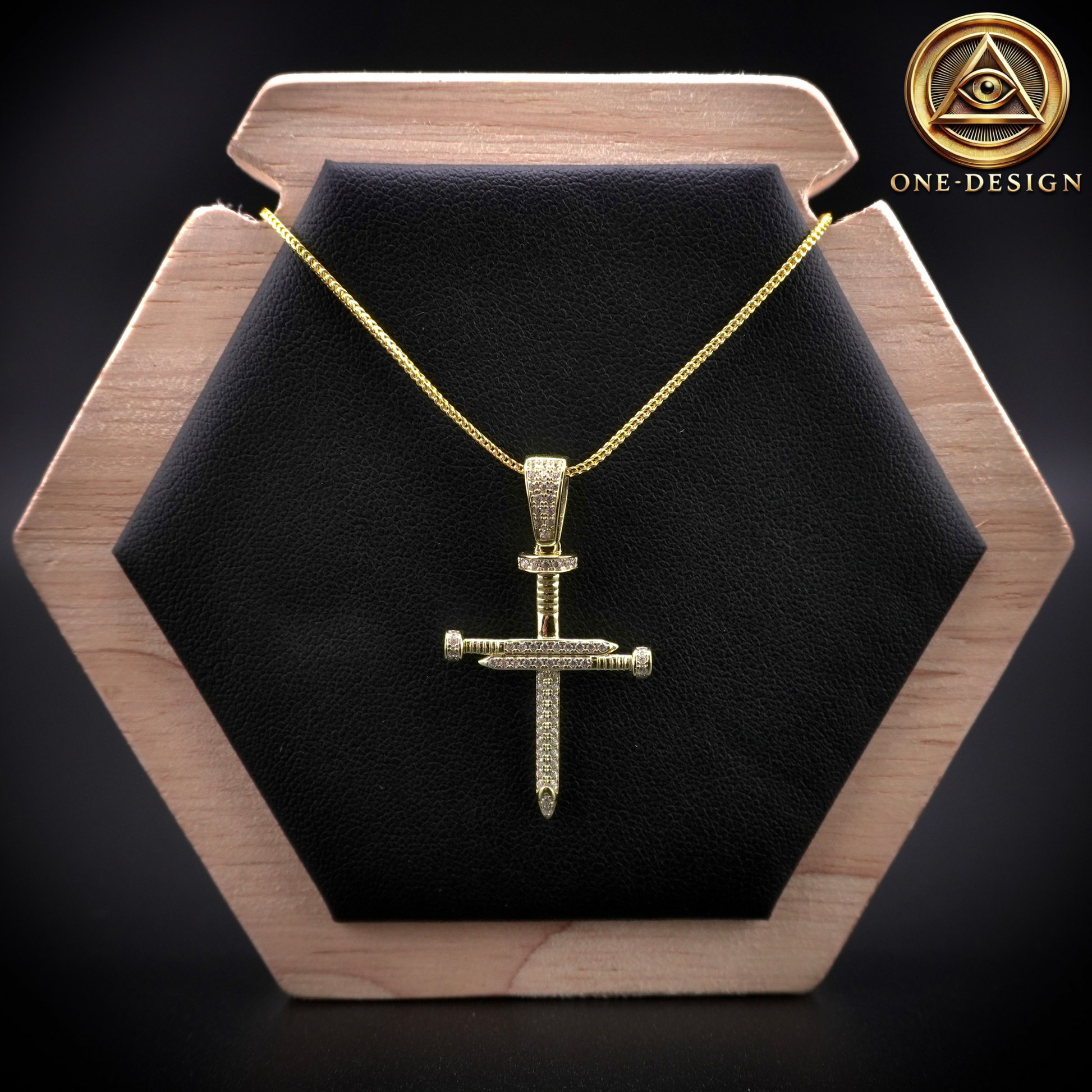 "Plata 925 con baño de oro 14k , diseñado para fuerza. Colgante y cadena "clavos" con micro piedras engastadas, brillo excepcional y diseño sofisticado. Cadena incluida 1mm.