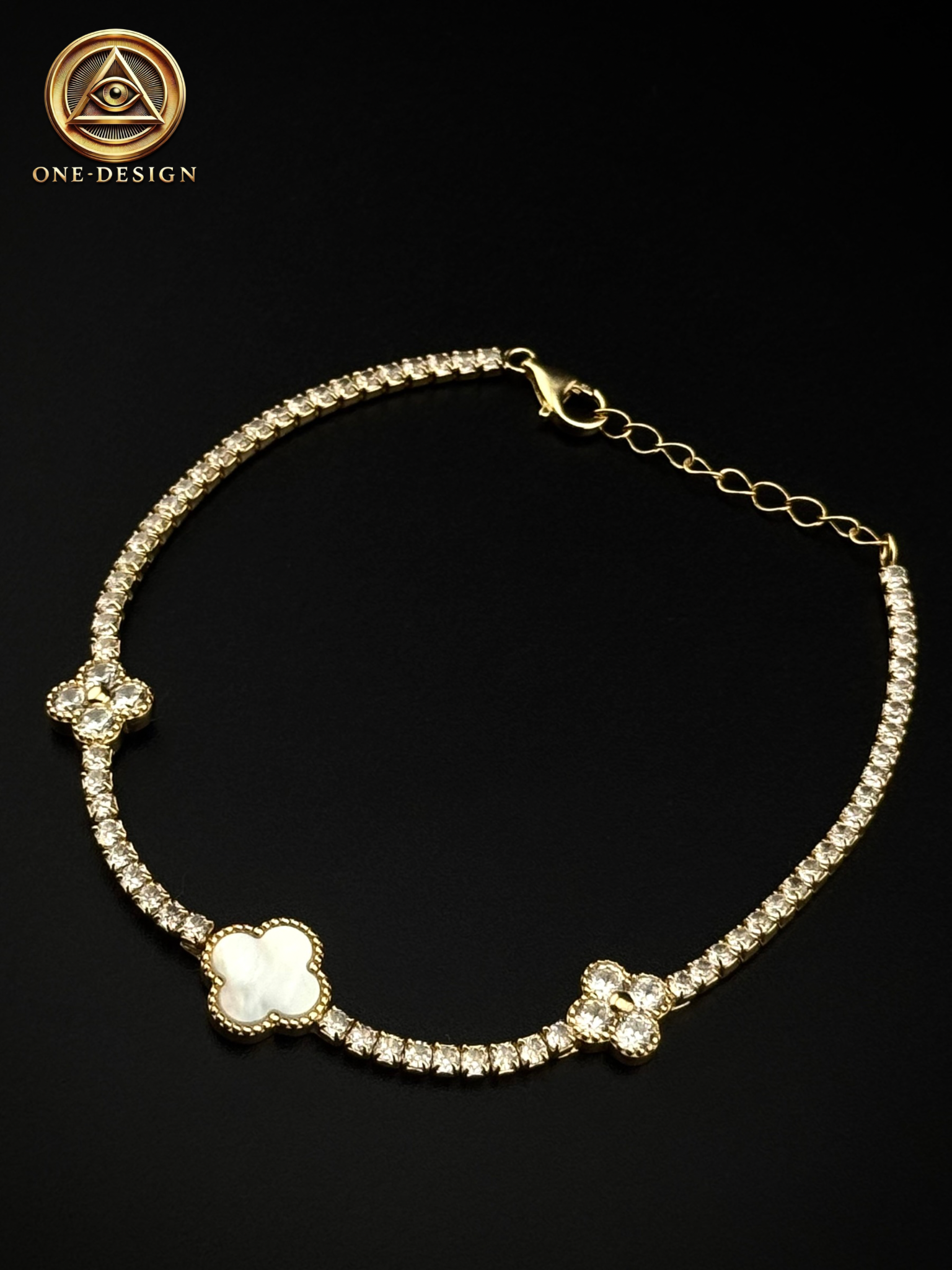 ¡Luce un brillo y lujo incomparable con nuestra exclusiva pulsera de clover! Hecha en plata 925 baño de oro, su diseño ajustable y piedras brillantes en todo su contorno te dará un look sofisticado y elegante. Las hojas llenas de brillo son un detalle único e irresistible. ¡Atrévete a destacar con esta pulsera única!