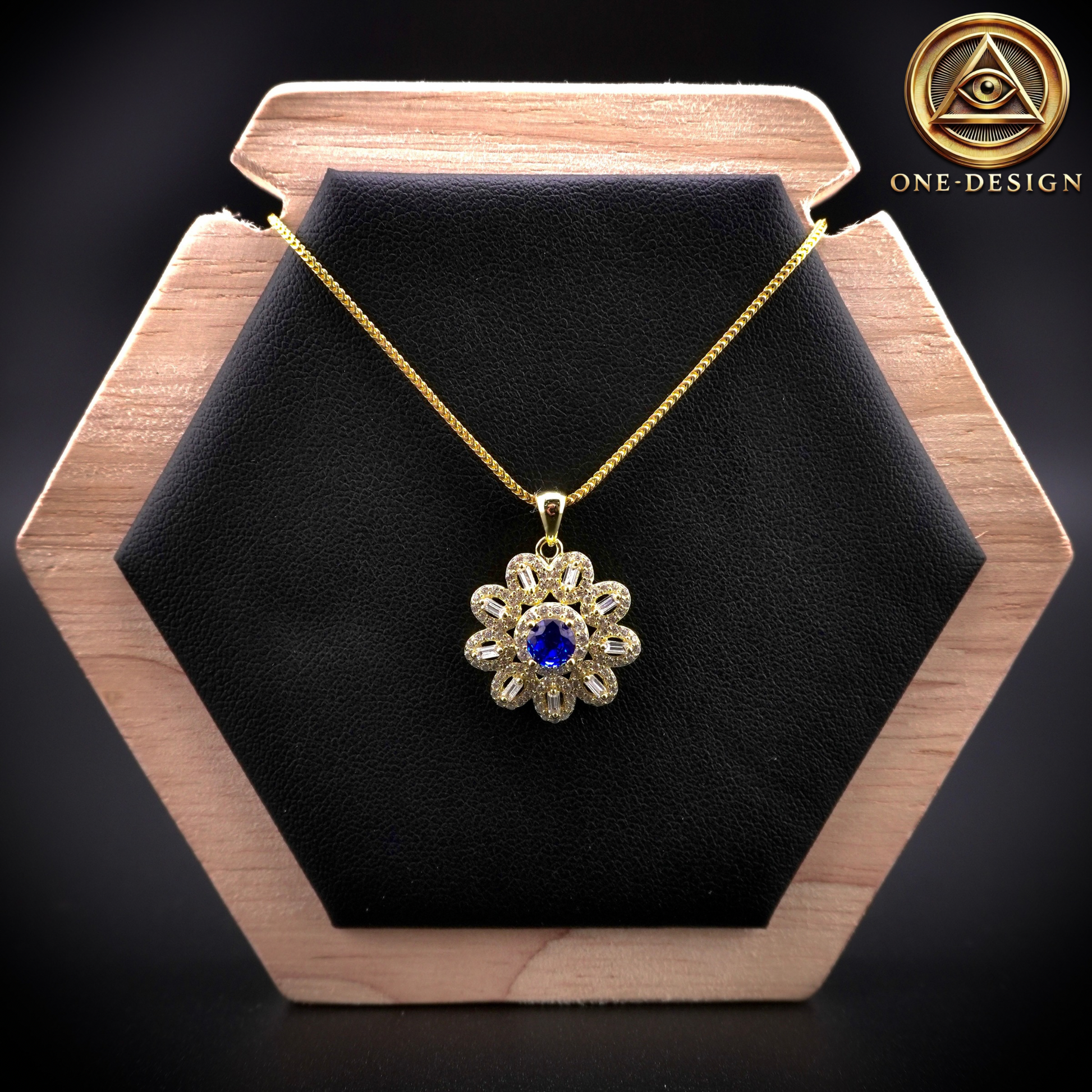 Esta hermosa flor azul es una pieza de ensueño hecha en plata 925 baño de oro. Incluye una cadena de 1mm y está diseñada con piedras brillantes, con una piedra azul en el centro. Agrega un toque de elegancia y brillo a tu atuendo con esta pieza de joyería de alta calidad.