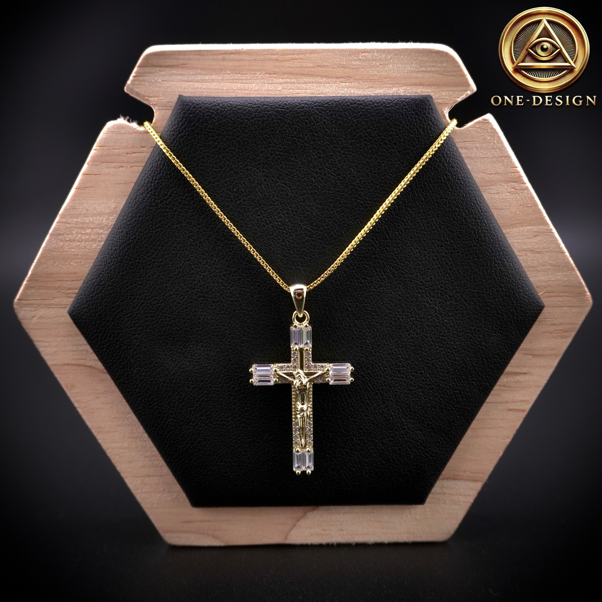 Esta hermosa cruz tallada con cortes en forma de baguette en cada punta es un accesorio único y original que no puede faltar en tu colección de joyería. Hecha en plata 925 y bañada en oro, incluye una cadena de 1mm para completar su elegante apariencia. Demuestra tu fe y estilo con Cross BG.