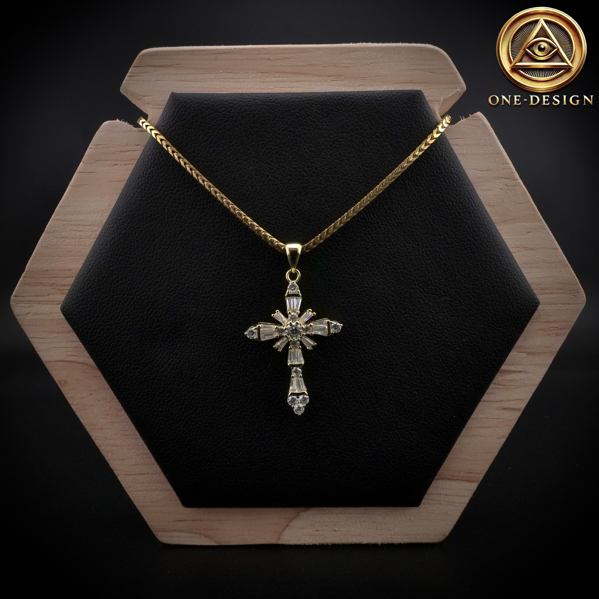 Esta hermosa pieza de joyería está hecha con plata de ley 925 de alta calidad y bañada en oro, añadiendo un brillo y elegancia a su estilo un corte en baguette en sus piedras. Además, su significado simbólico y su cadena incluida de 1mm la convierten en una pieza esencial para expresar su fe y dar un toque especial a su atuendo.