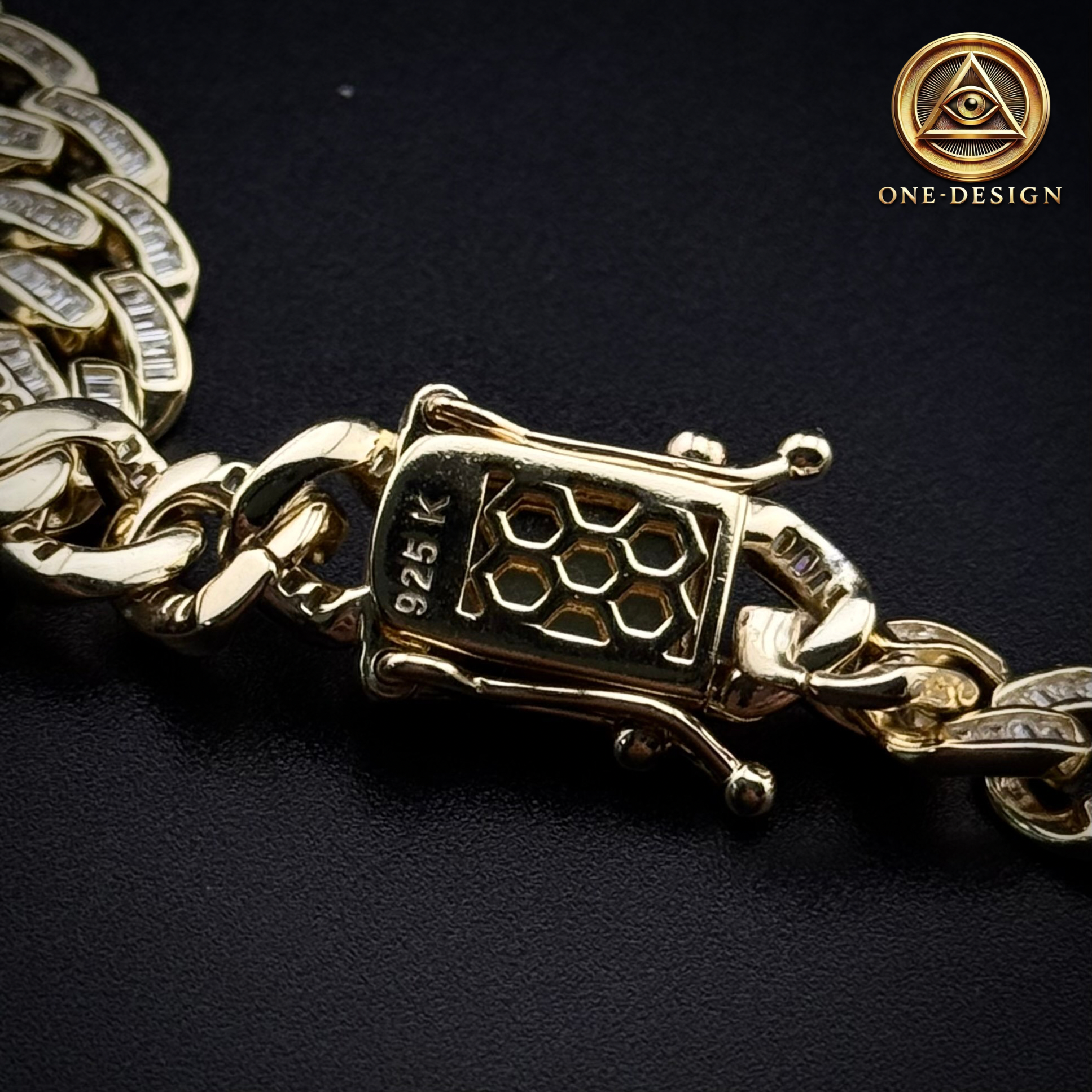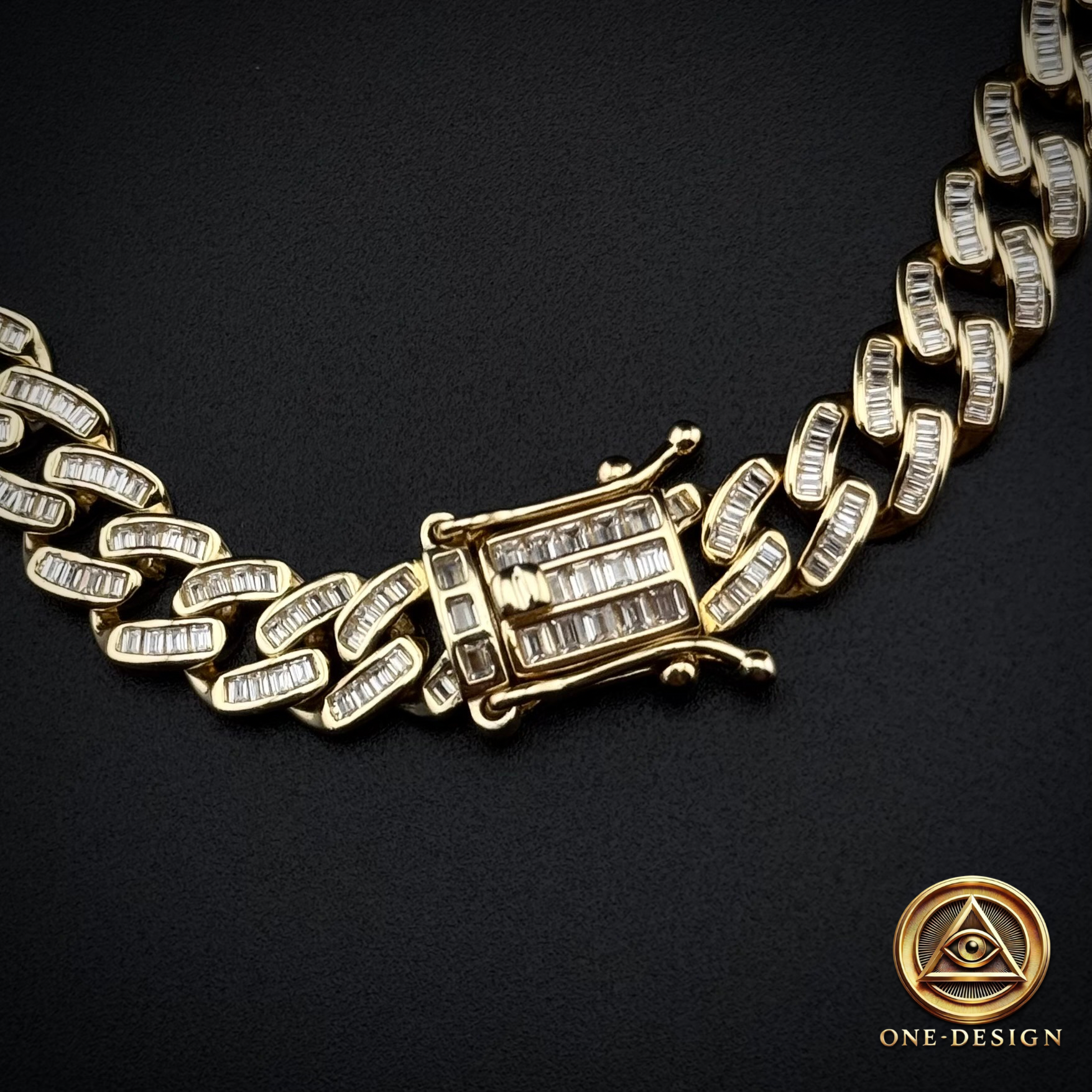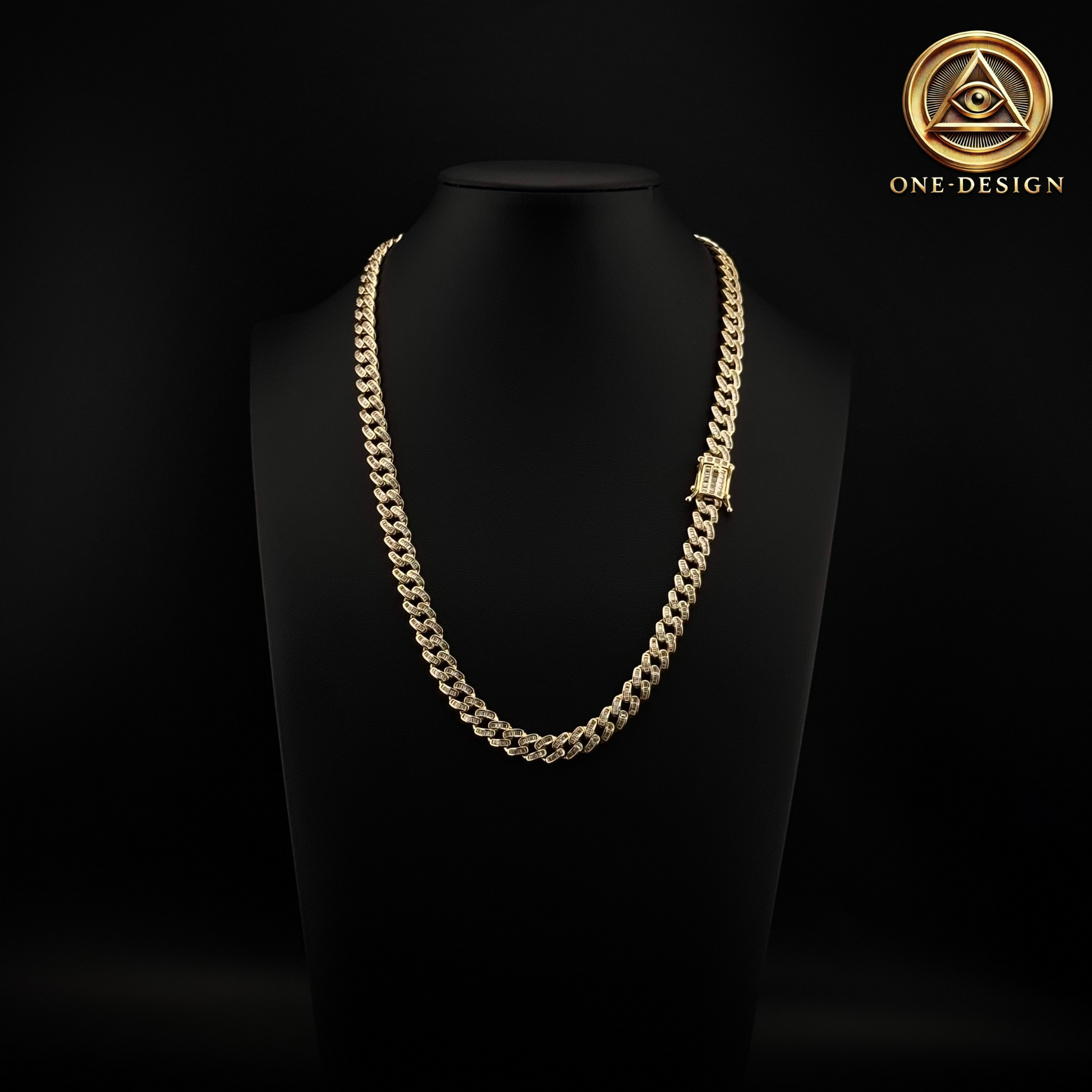 Cubana cut baguette largo 20” 7mm elaborada en plata 925 con baño de oro, diseñada para quienes buscan un accesorio de lujo con un diseño sofisticado y llamativo.