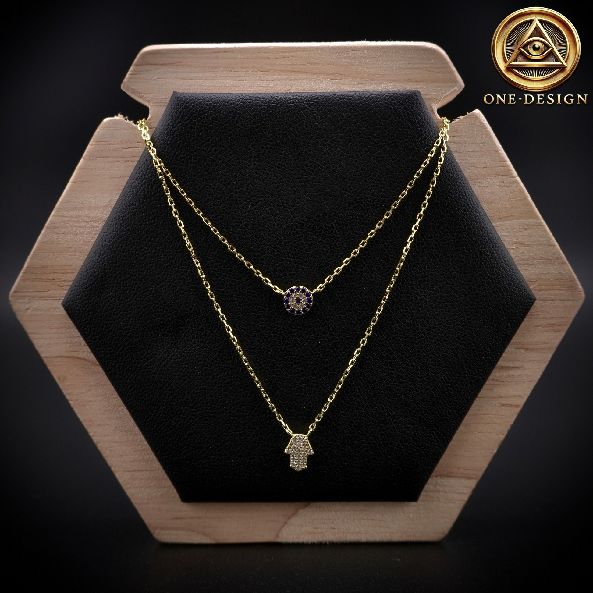 Disfruta de la elegancia y sofisticación con Fatima, un exclusivo collar de plata 925 acabado en oro con un diseño de doble collar ajustable. Una pieza única que resalta tu belleza con su brillo único. Añade un toque de glamour a tu estilo con este collar expertamente diseñado.