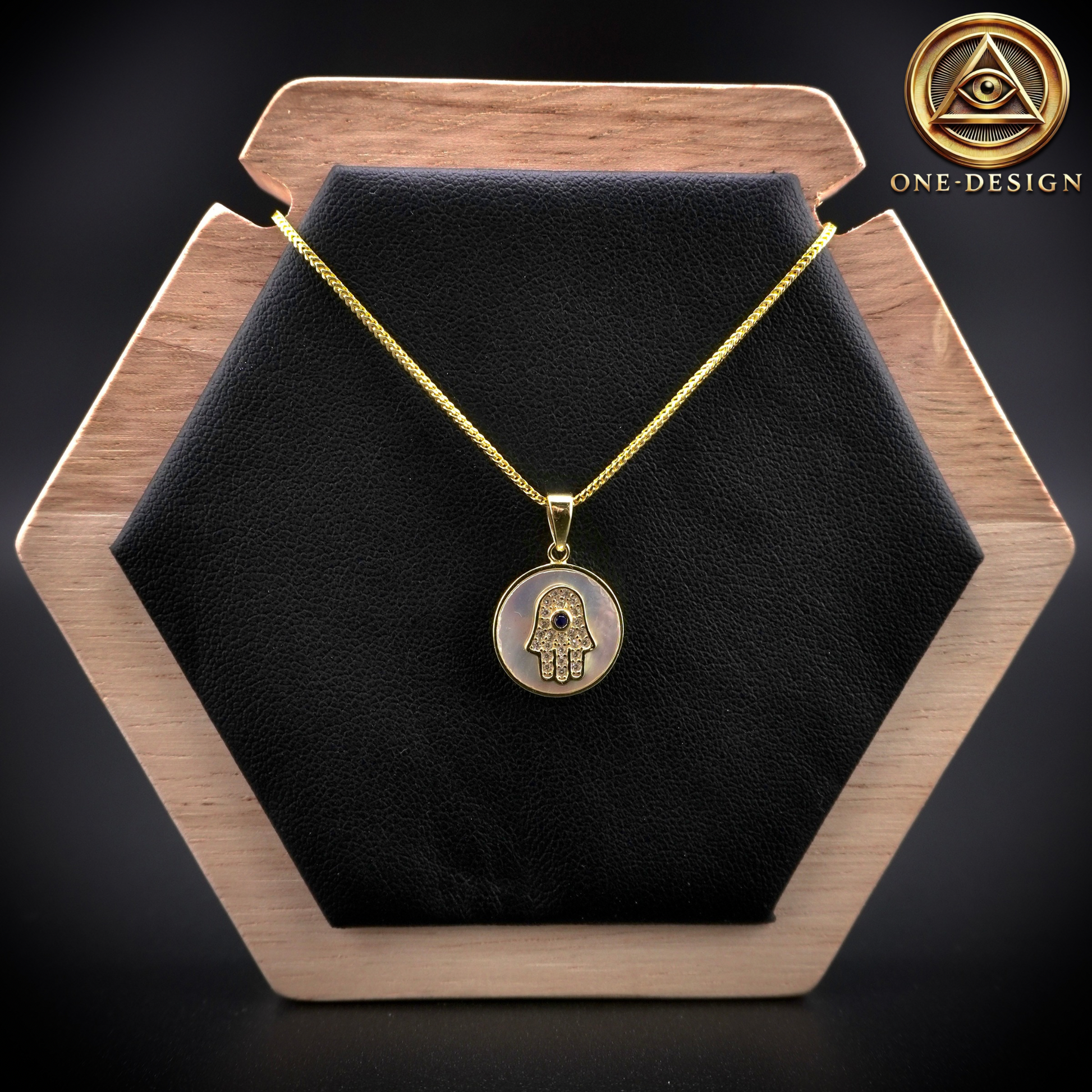 Fátima es una joya de plata 925 bañada en oro que incluye una cadena de 1mm Su hermosa mano dentro de un círculo perlado la hace perfecta para cualquier ocasión. Con un diseño elegante y delicado, esta pieza es perfecta para añadir un toque de sofisticación a cualquier atuendo.