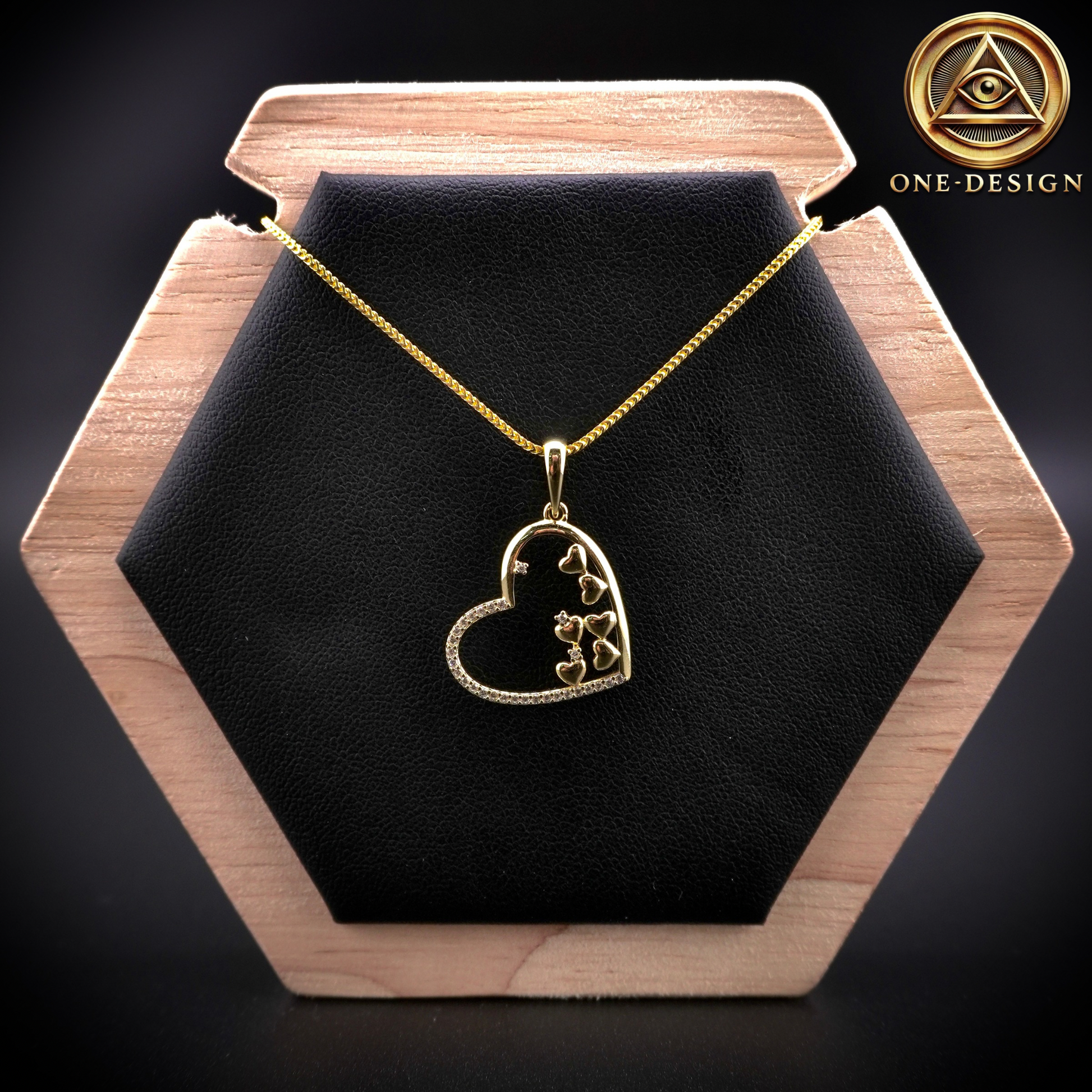 Este corazón con corazones es una hermosa pieza de joyería elaborada en plata 925 y bañada en oro. Su diseño minimalista y elegante incluye una cadena de 1mm, lo que la hace perfecta para lucir en cualquier ocasión. Además, su material de alta calidad asegura su durabilidad y resistencia.