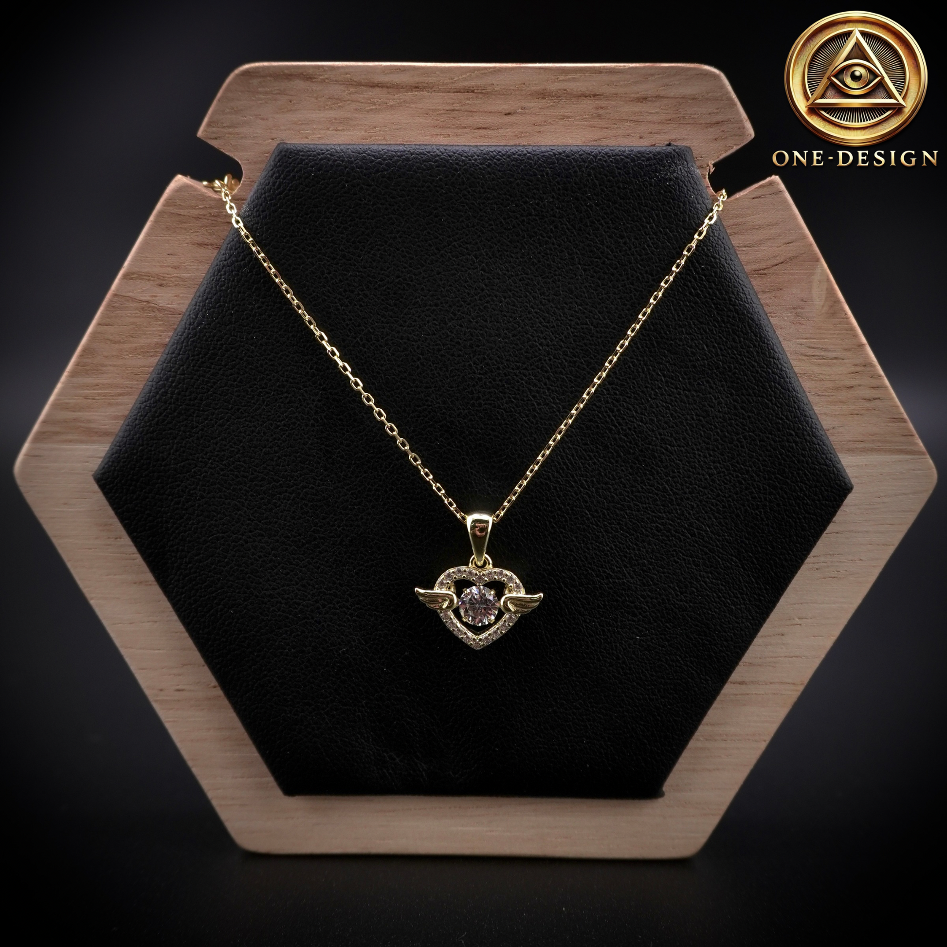Este elegante collar ajustable con dije de corazón con alas, elaborado en plata 925 acabado en oro, combina un diseño delicado con un significado profundo. Su estilo refinado y simbólico lo convierte en el accesorio perfecto para quienes buscan una joya que represente amor.