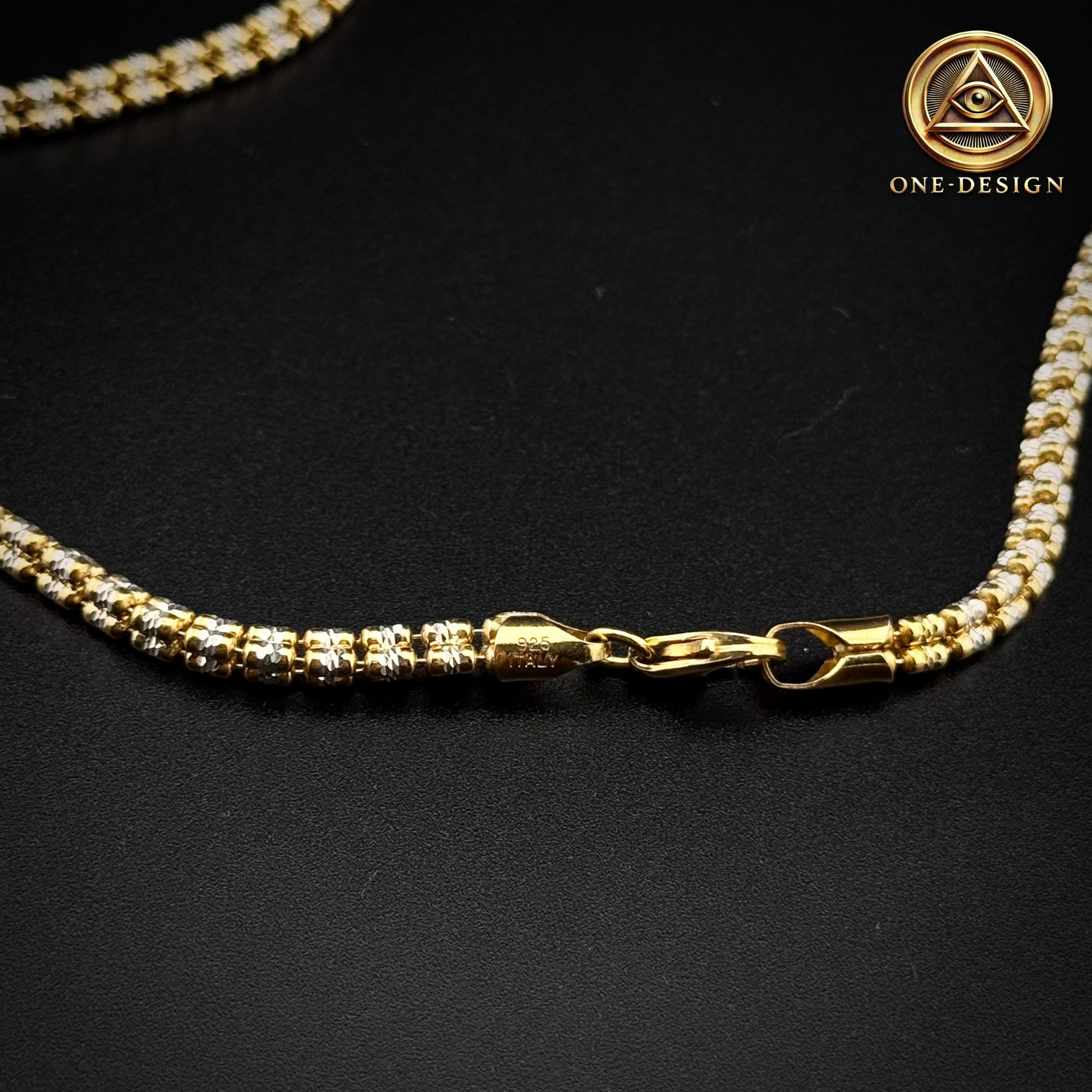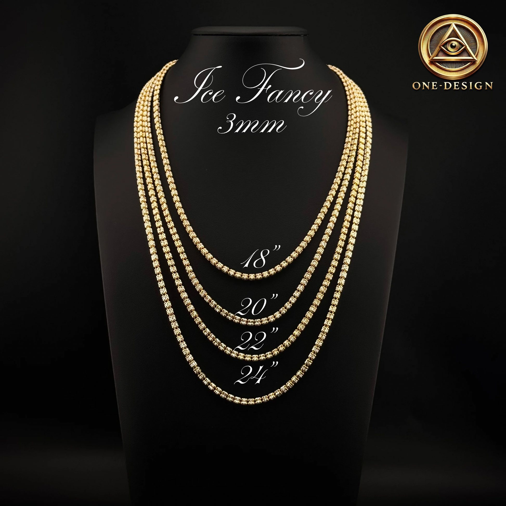 Esta pieza de joyería, Ice fancy 3mm, es hecha en plata 925 y bañada en oro de 2 tonos. Con un brillo impresionante y un estilo único, esta pieza es perfecta para agregar un toque de elegancia a cualquier atuendo. Con su diseño de 3mm, es la combinación perfecta de delicadeza y estilo.