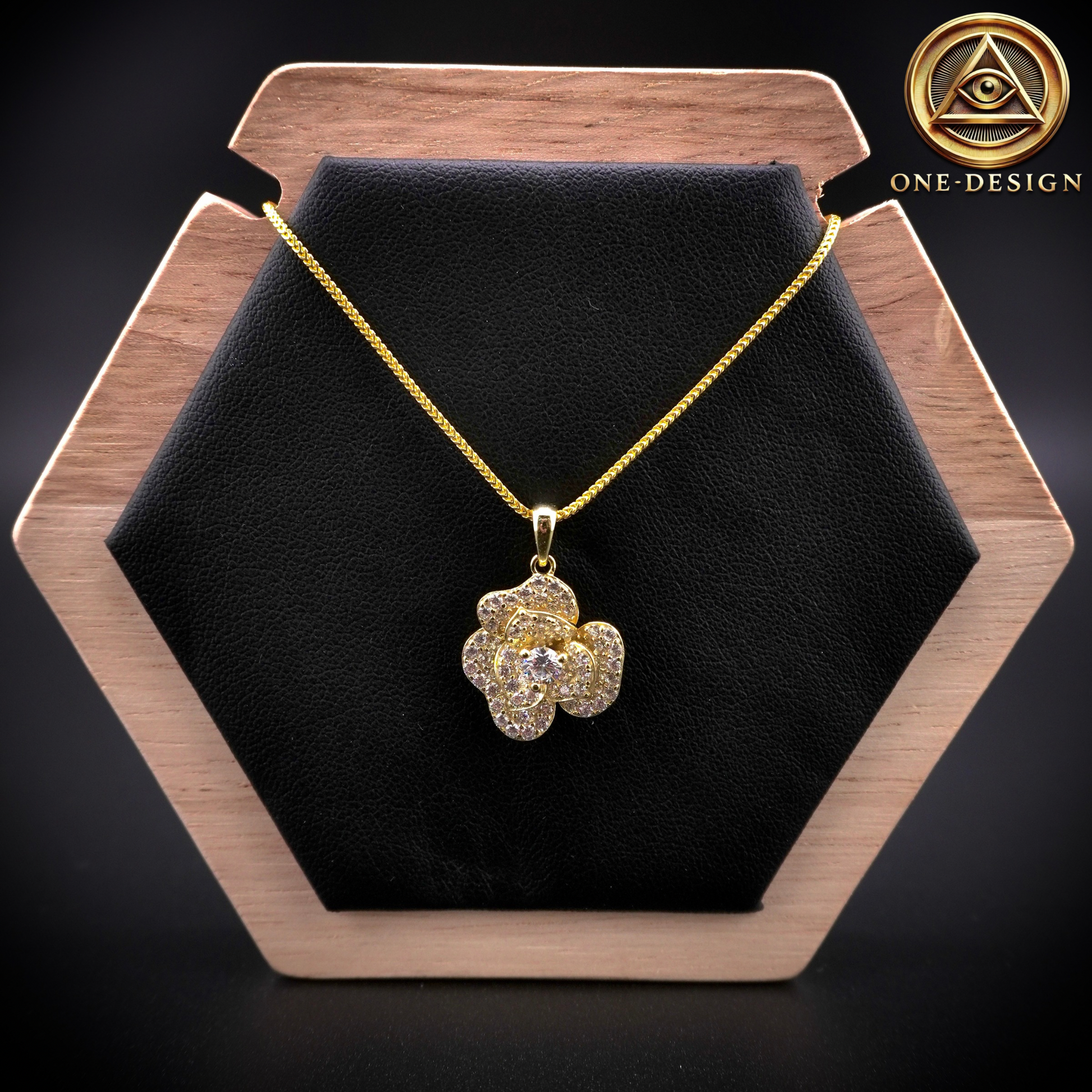 La flor de hielo es una pieza de joyería única y elegante. Hecha de plata 925 con un baño de oro, esta hermosa flor está rellena de piedras brillantes que le dan un brillo impresionante. Incluye una cadena de 1mm para lucirlo con estilo. Agrega un toque de elegancia a tu atuendo con esta joya.