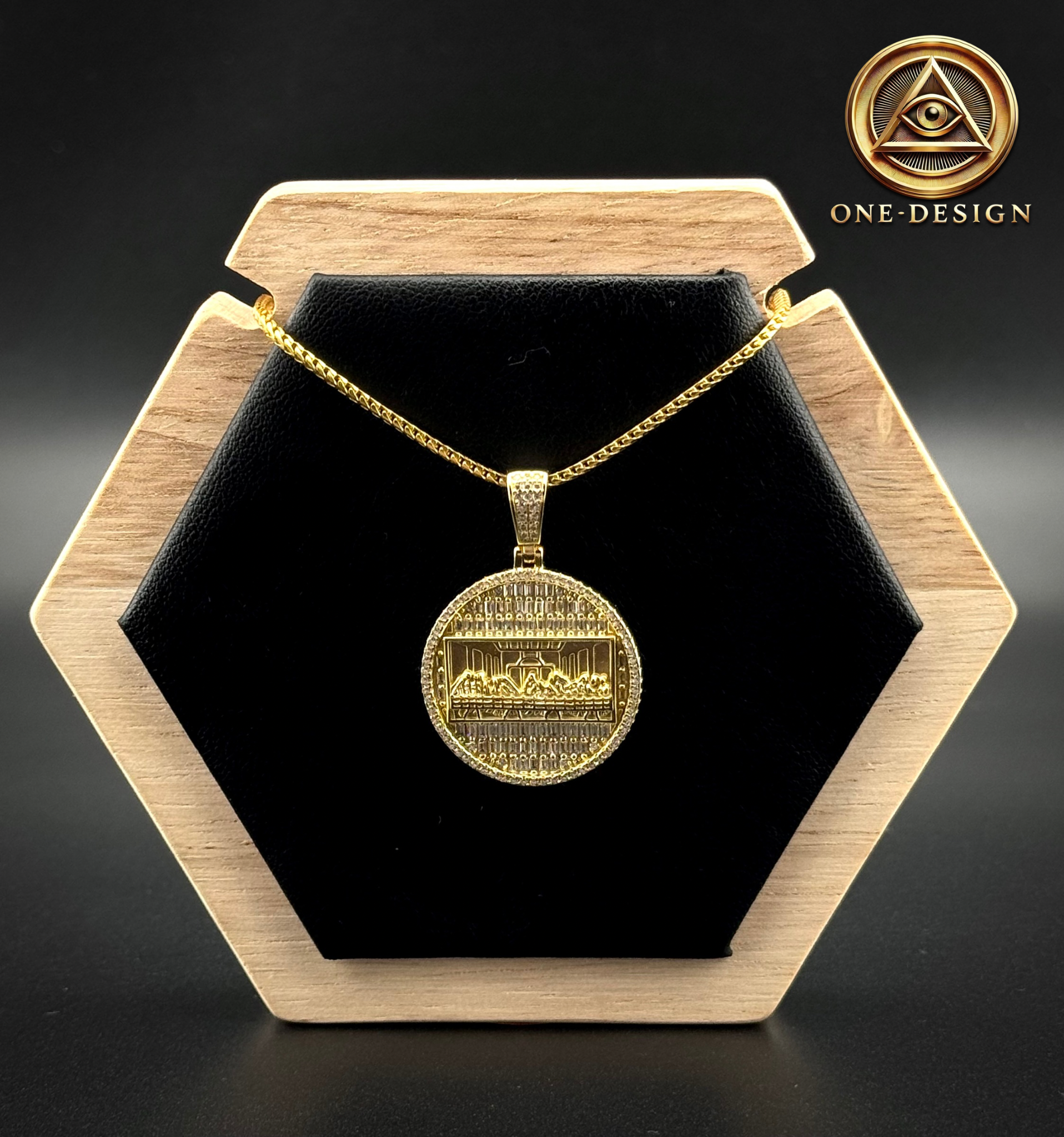 Esta hermosa santa cena es una pieza de joyería única y radiante que seguro llamará la atención. Hecha en plata 925 con un baño de oro, cuenta con cortes de piedras baguette que la hacen brillar. Además, incluye una cadena de 1.5mm, lo que la hace aún más especial. Un símbolo de significado y belleza en una sola pieza.
