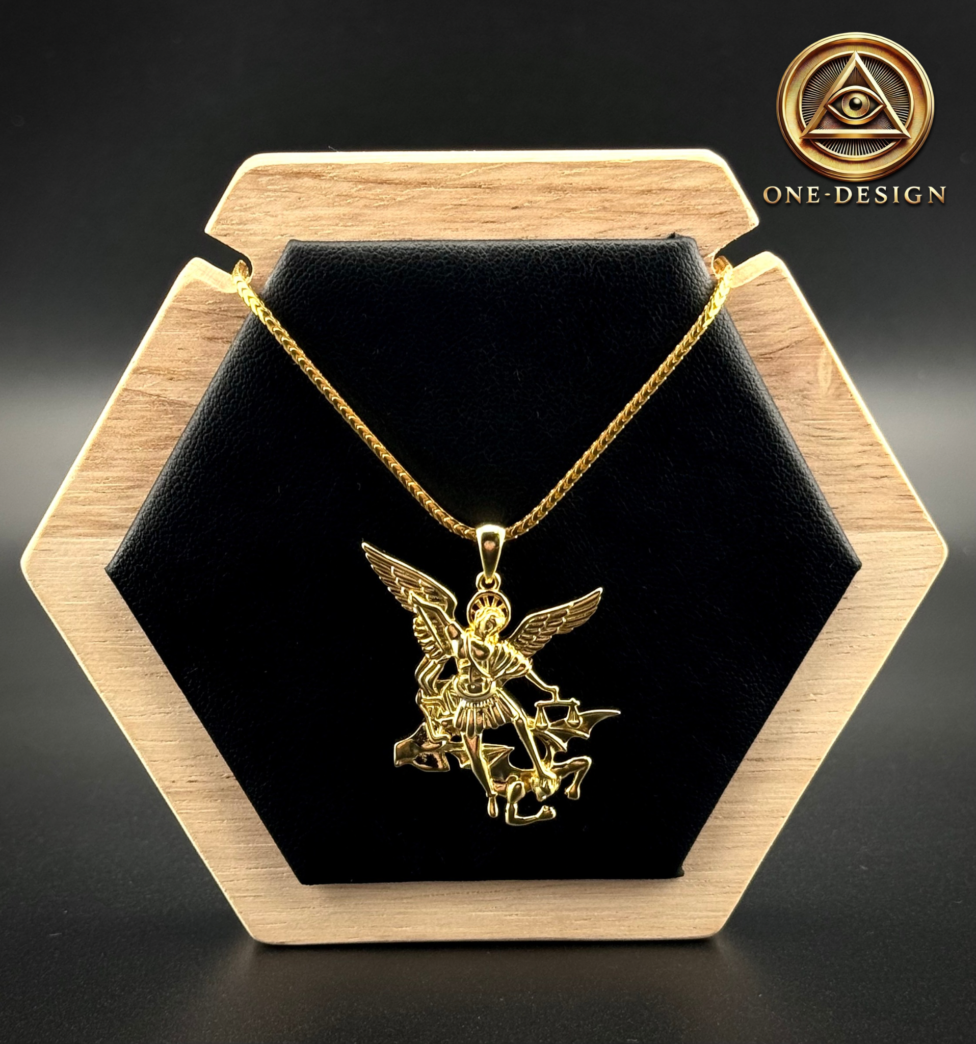 Este hermoso arcángel de color dorado está hecho completamente en plata 925 con un baño de oro. Llévalo contigo para invocar a tu guerrero interior. Incluye una cadena de 1.5mm para tu comodidad.