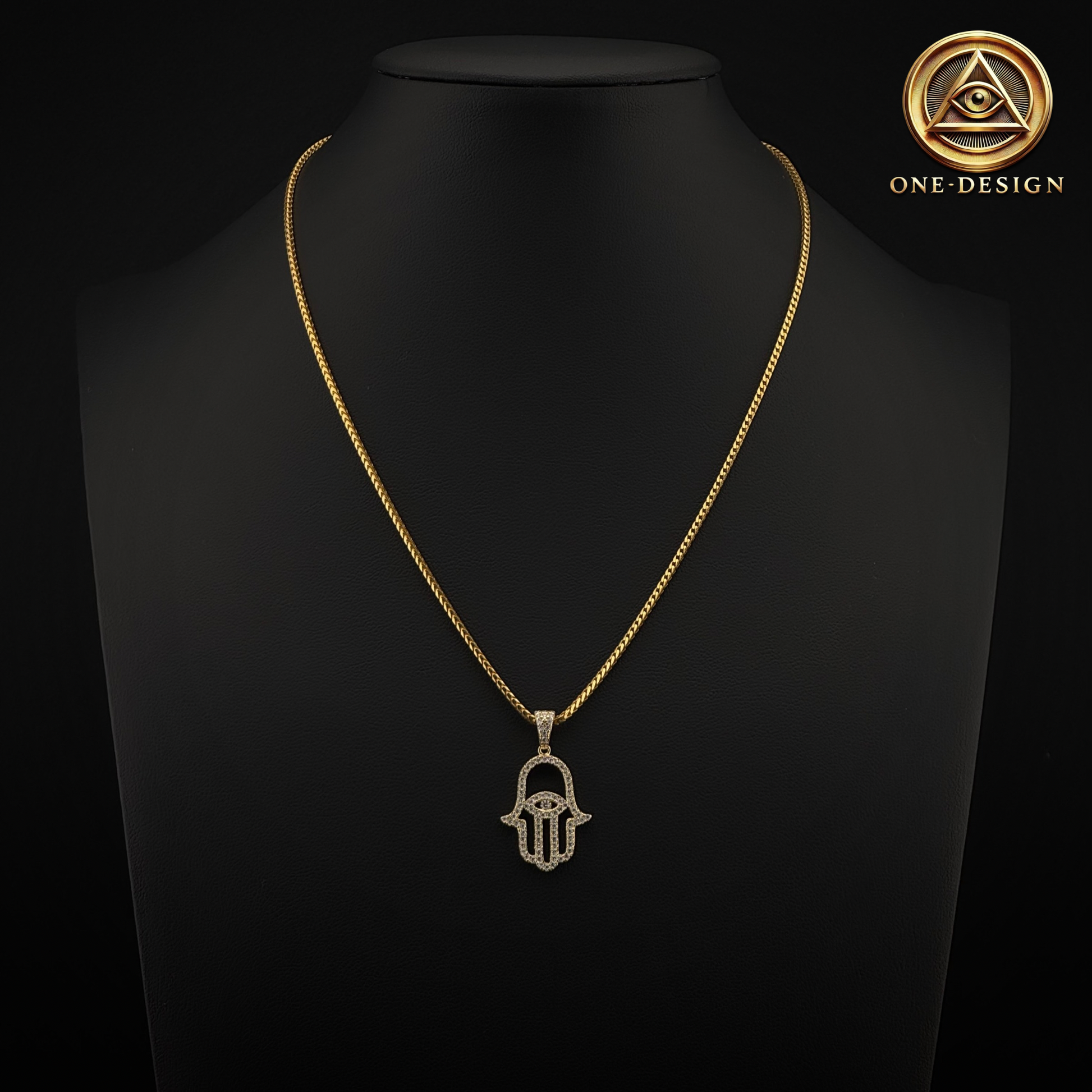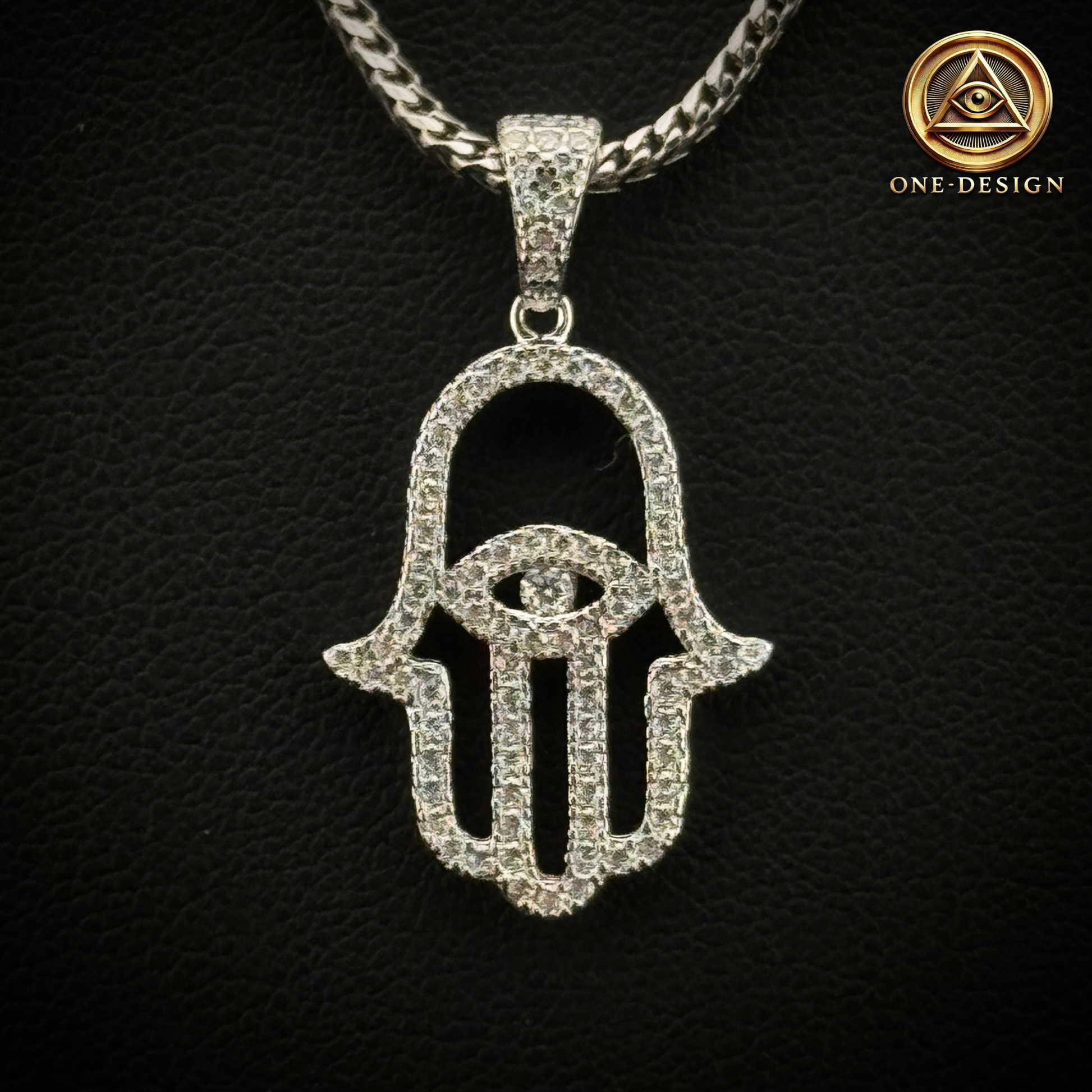 "Collar Moissanite Eye Hamsa con cadena incluida 1.5mm. Hecho en plata 925 y plata 925 con baño de oro. Ofrece lujo, brillo y protección para una abundante vida. Perfecto para llevar siempre contigo, no pierdas la oportunidad de tener esta joya única."