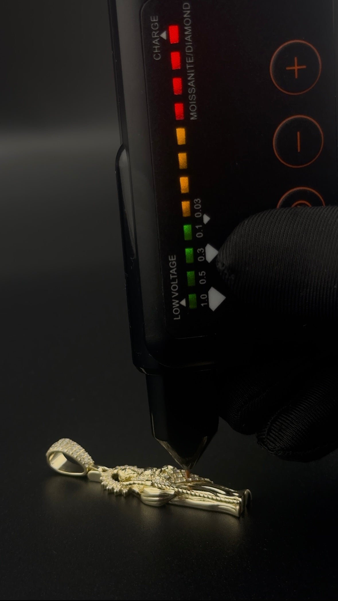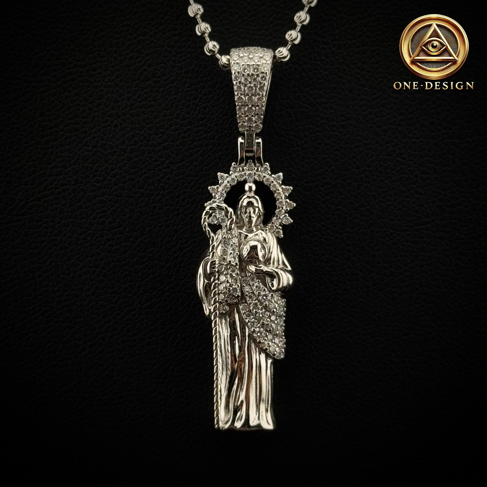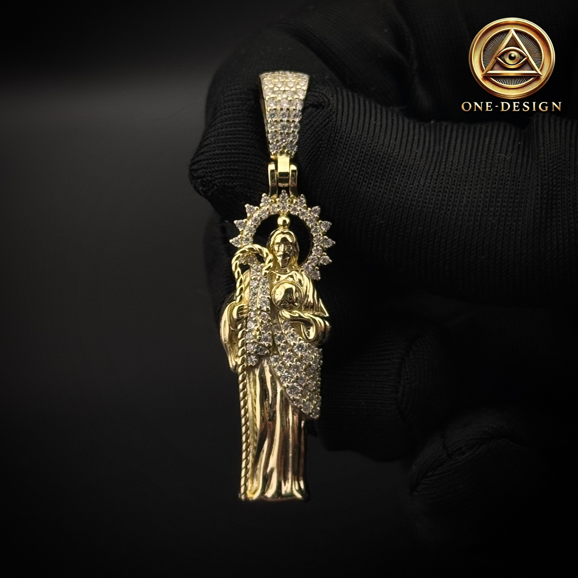 Descubre la belleza y durabilidad de las piedras Moissanite con nuestra pieza de plata 925 y plata 925 bañada en oro. La cadena de 1.5mm incluida agrega un toque elegante. Hecha especialmente para los devotos, esta pieza del santo está llena de amor y significado. ¡Hazla parte de tu colección hoy!