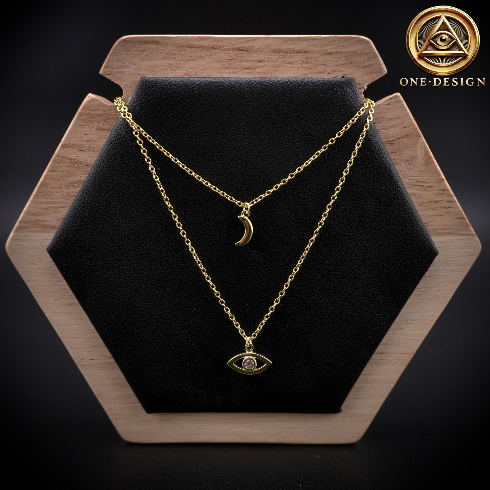 El collar Ojo de Luna cuenta con un diseño único de doble collar, elaborado en plata 925 con acabado en oro. Doble collar Ajustable Resalta tu delicadeza y sofisticación con este accesorio que combina elementos de la naturaleza y la elegancia. Perfecto para lucir en cualquier ocasión.
