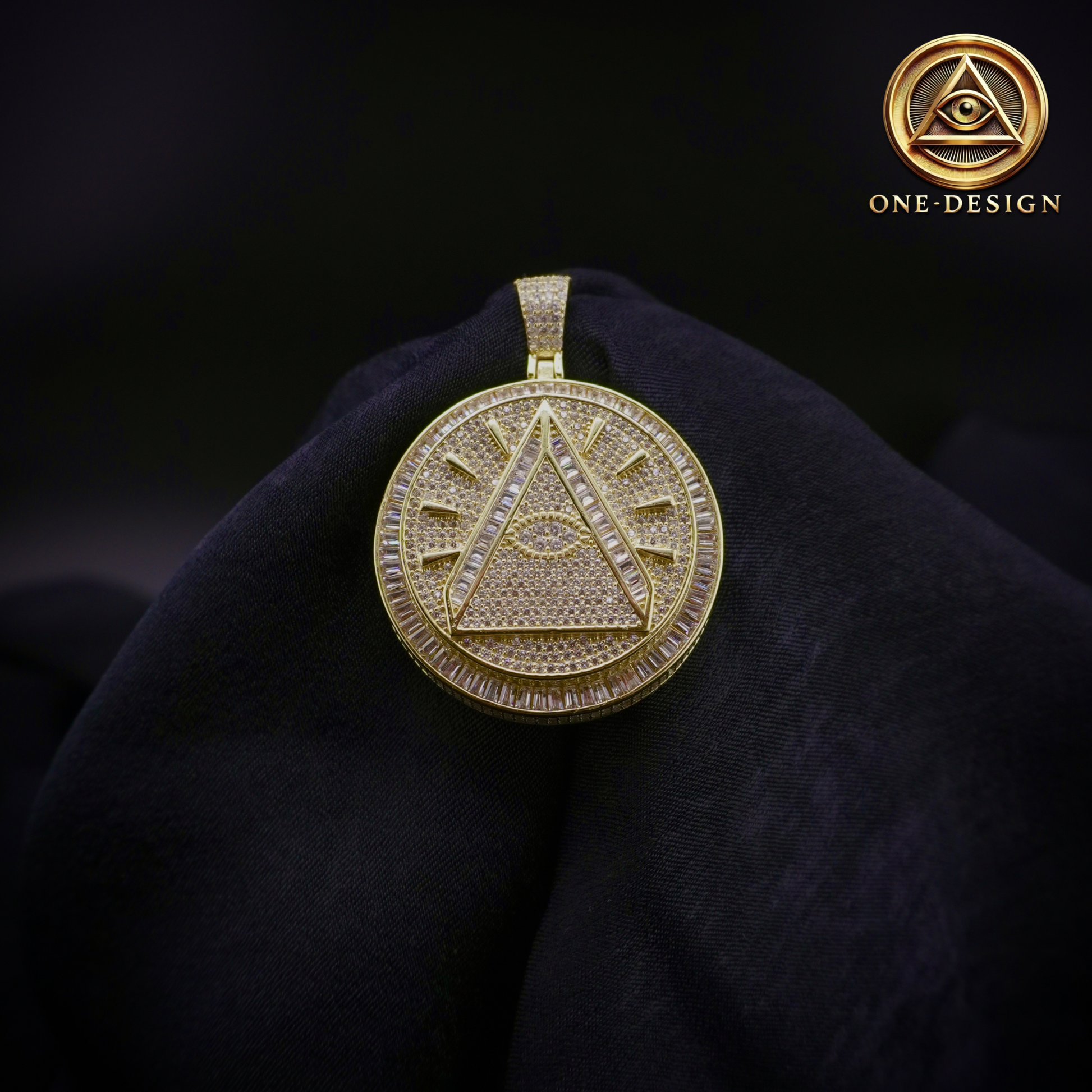 Colgante del Ojo de la Providencia, elaborado en plata 925 con baño de oro 14k, incluye cadena 1.5mm con un diseño imponente y simbólico. Su forma circular está decorada tipo baguette alrededor del borde, mientras que el centro presenta el icónico triángulo con un ojo, resaltado y detalles en relieve que evocan poder y conocimiento.