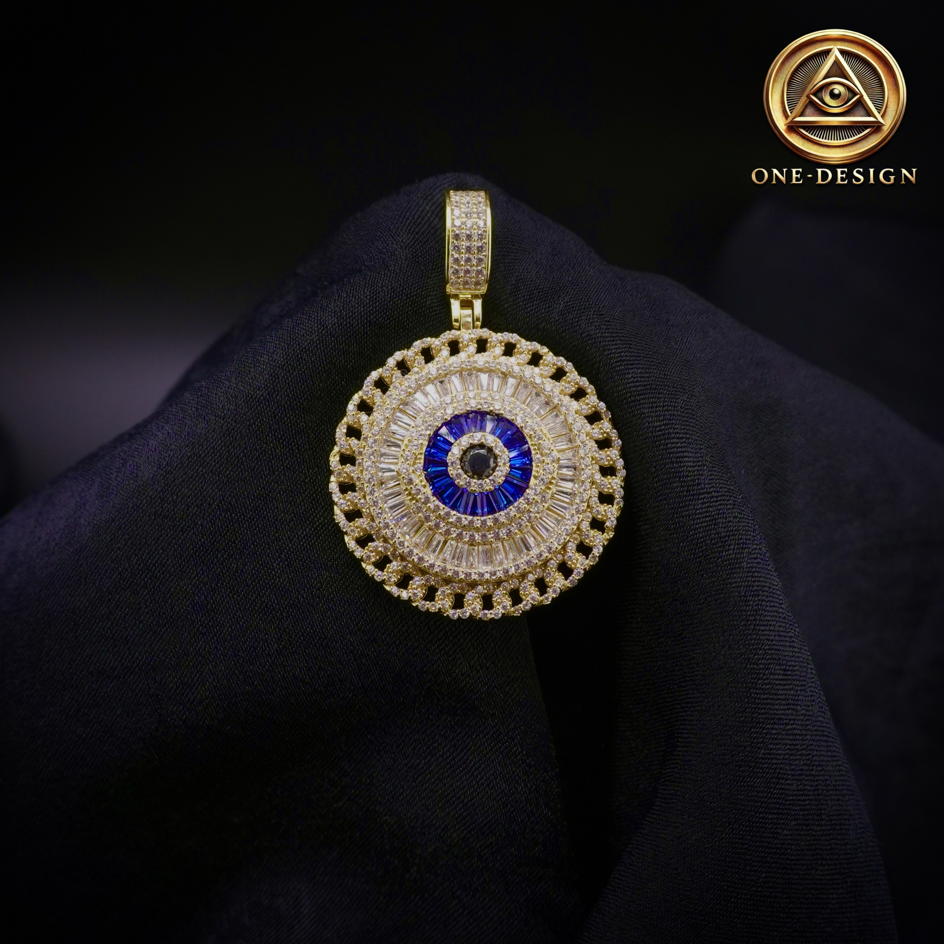 Colgante de Ojo Turco, elaborado en plata 925 con baño de oro, incluye cadena 1mm con un diseño sofisticado y lujoso. Su estructura circular está adornada tipo baguette y un centro en tonos azul, negro y blanco, simulando el tradicional ojo protector. Su borde calado y la incrustación de micro zirconias en el asa le dan un acabado detallado y elegante.