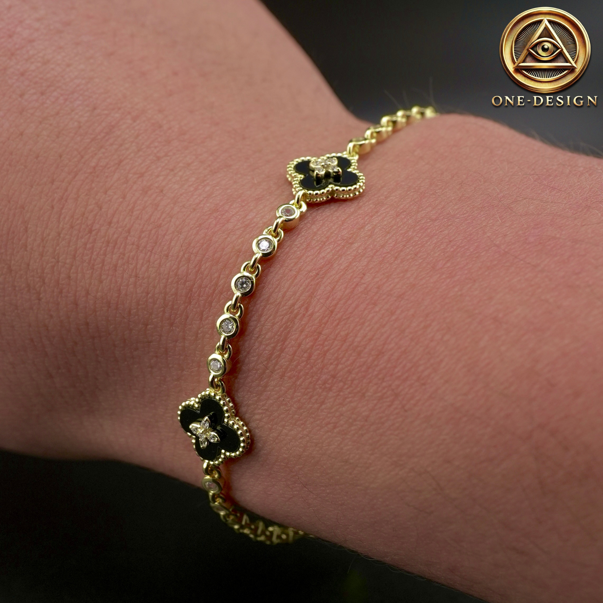La pulsera combina una fina cadena de piedras engastadas con dijes en forma de trebol, cada uno con una piedra en el centro para un efecto sofisticado y delicado. Este diseño simboliza la buena suerte, la protección y la fortuna, haciendo de esta pulsera una pieza especial y con significado.