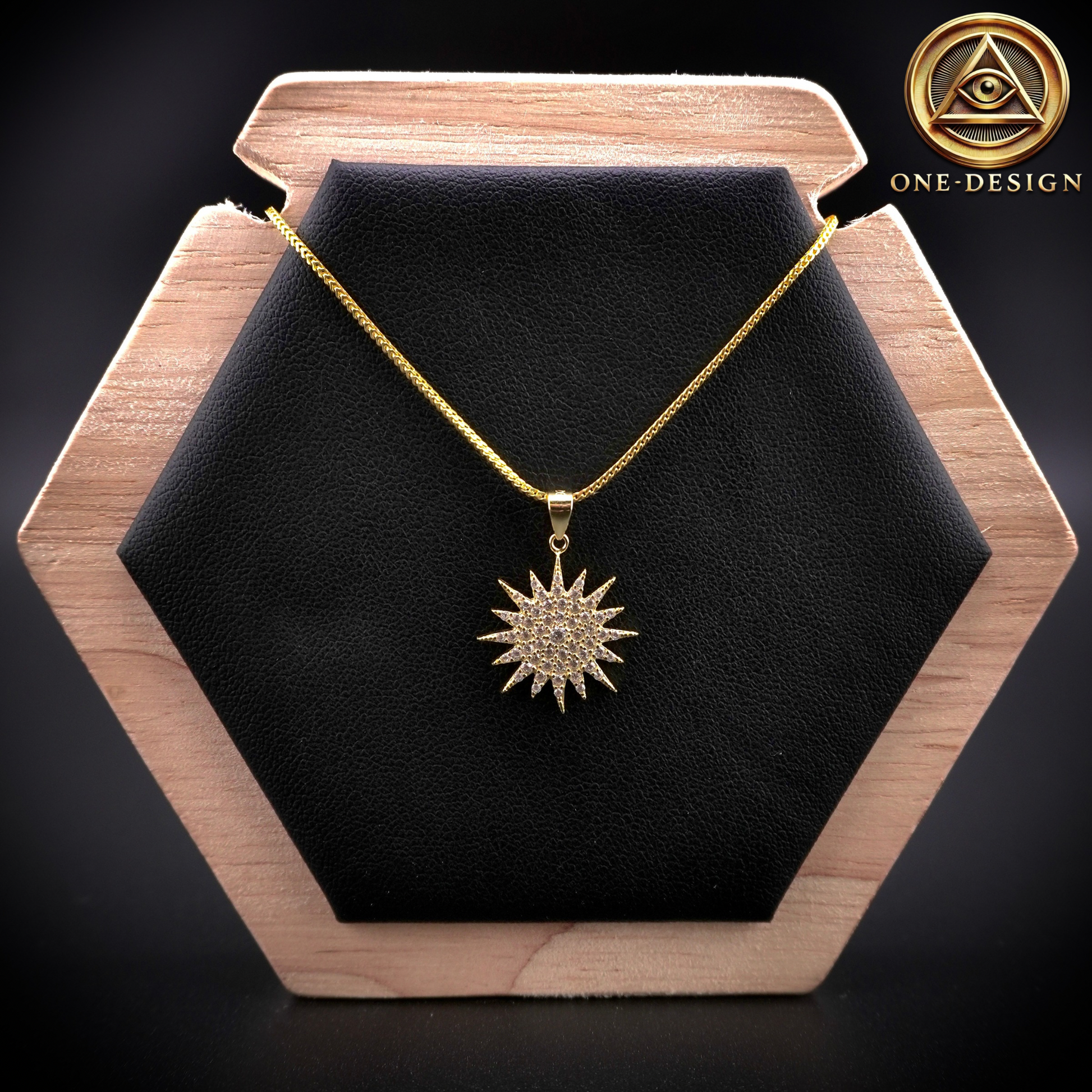 Esta pieza de joyería de sol está elaborada con plata 925 y bañada en oro, lo que le da un toque elegante y duradero. Incluye una cadena de 1mm para que puedas lucirla de inmediato. La pieza está adornada con piedras brillantes, lo que la convierte en una hermosa adición a cualquier atuendo. ¡Luce radiante con esta pieza única y de alta calidad!